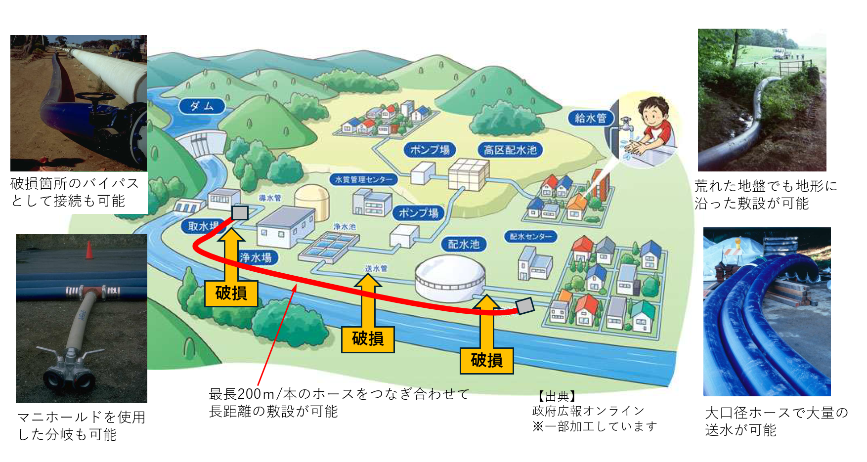 近年、台風や地震などの激甚災害が頻発しており、多くの被害が出ております。 浄水場や排水池など上水道システムの基幹施設が被災したり、地盤や周辺道路の崩落や液状化によって、復旧までの期間が長期化しています。多くの方の生活に影響をもたらす水道の断水時において、スーパーアクアダクトホースを使用した新たな早期復旧方法を提案致します。
