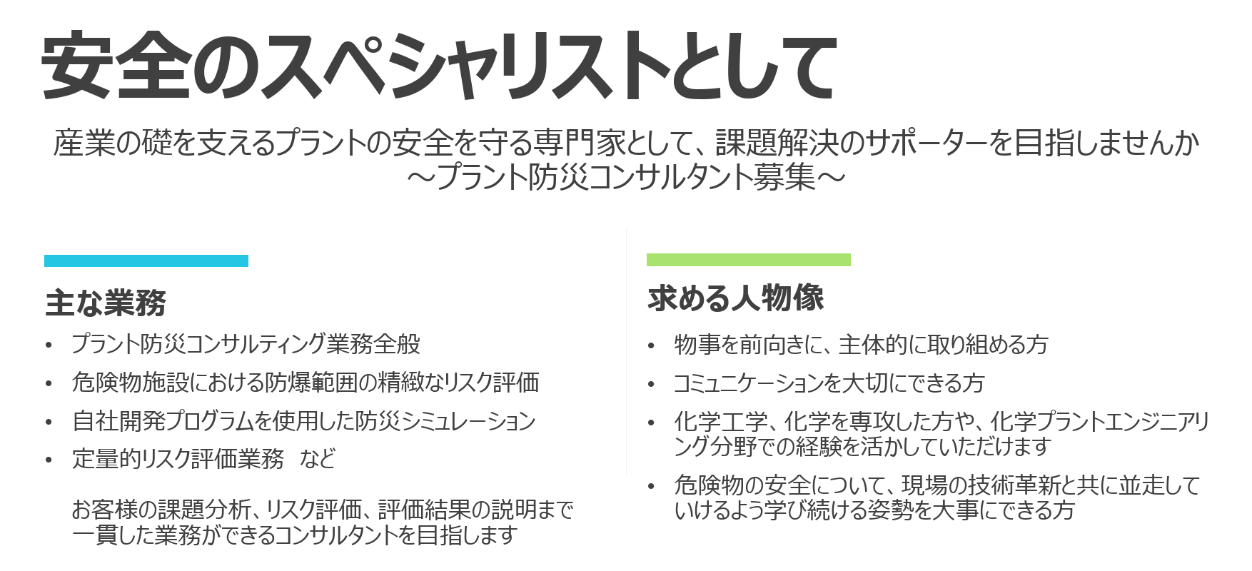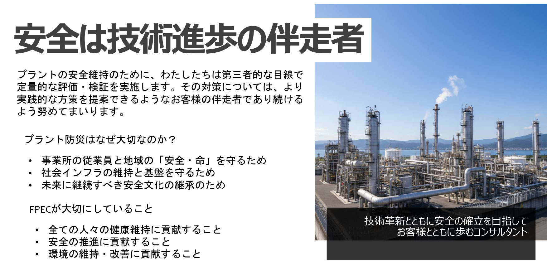 弊社は、日本で唯一,危険物を取り扱うプラント防災に特化したコンサルティング会社です。またプラントの防災システムの基本設計に豊富な経験による知見を得て、単にアドバイスするだけではなく実際的なバックグランドをベースに実効性のあるコンサルティングを実施しております。